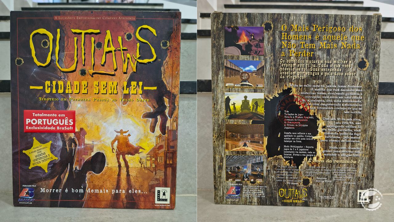 - Outlaws: Cidade Sem Lei - Um jogo de tiro em primeira pessoa que possui uma estética única de velho oeste. Lançado em 1997 pela LucasArts, eu consegui este jogo num golpe de sorte, pois segundo a vendedora (muito simpática, por sinal) disse que comprei praticamente no mesmo minuto que o anúncio foi ao ar! Ela disse que não deu nem tempo de conferir como tinha ficado o anúncio e eu já tinha comprado. 😬