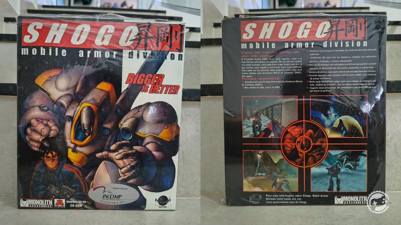 - Shogo: Mobile Armor Division - Por falar em achado, encontrar a versão nacional deste jogo foi mais um golpe de sorte. Vários colecionadores que conheço, nem sequer tinham visto a caixa dele antes. Este é um jogo de tiro em primeira pessoa que também varia para terceira pessoa, pois ele permite você controlar mechs! O jogo é de 1998 e foi produzido pela Monolith Productions, a mesma de Blood.