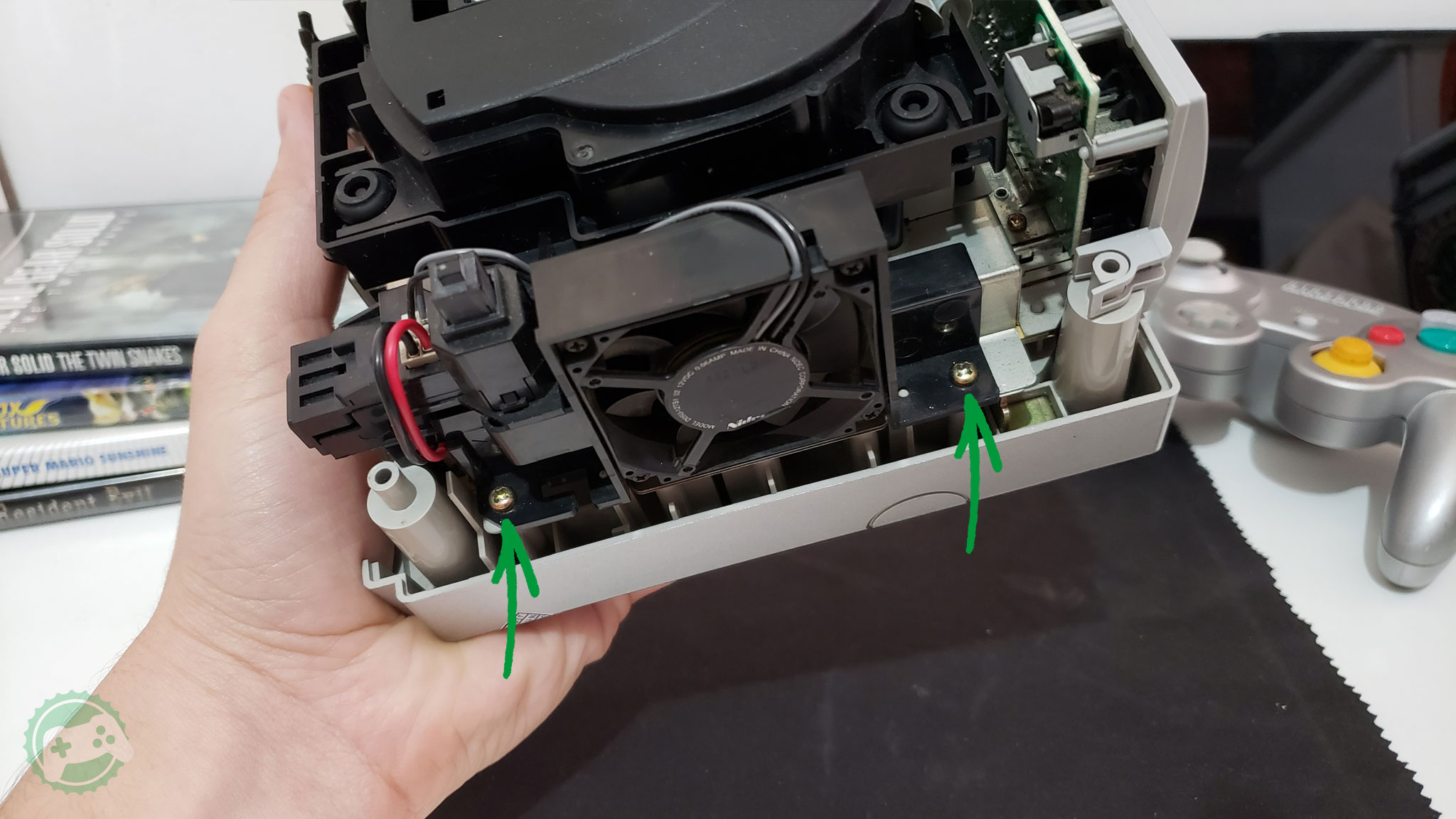 Para testar, você pode apenas encaixar a estrutura metálica de volta ao módulo do leitor, conectar o módulo na base, plugar a alimentação do cooler, conectar os cabos de energia e vídeo e sem a carcaça da tampa mesmo, colocar um disco e ligar. Para ligar o console, aperte o botão da esquerda e segure apertado o botão da direita (para simular a tampa fechada).