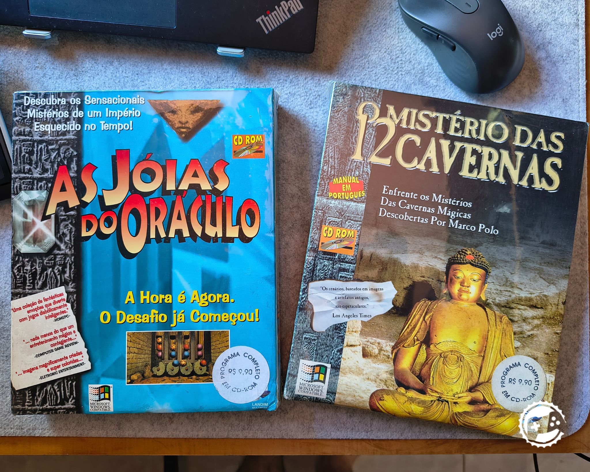 Esses dois eu achei meio que sem querer no marketplace do Facebook, nem sabia da existência deles até então. Ambos são jogos de aventura desenvolvidos em 1995 e distribuídos aqui no Brasil pela Landim Multimídia Ltda. Os títulos originais são: Jewels of the Oracle e Karma: Curse of the 12 Caves