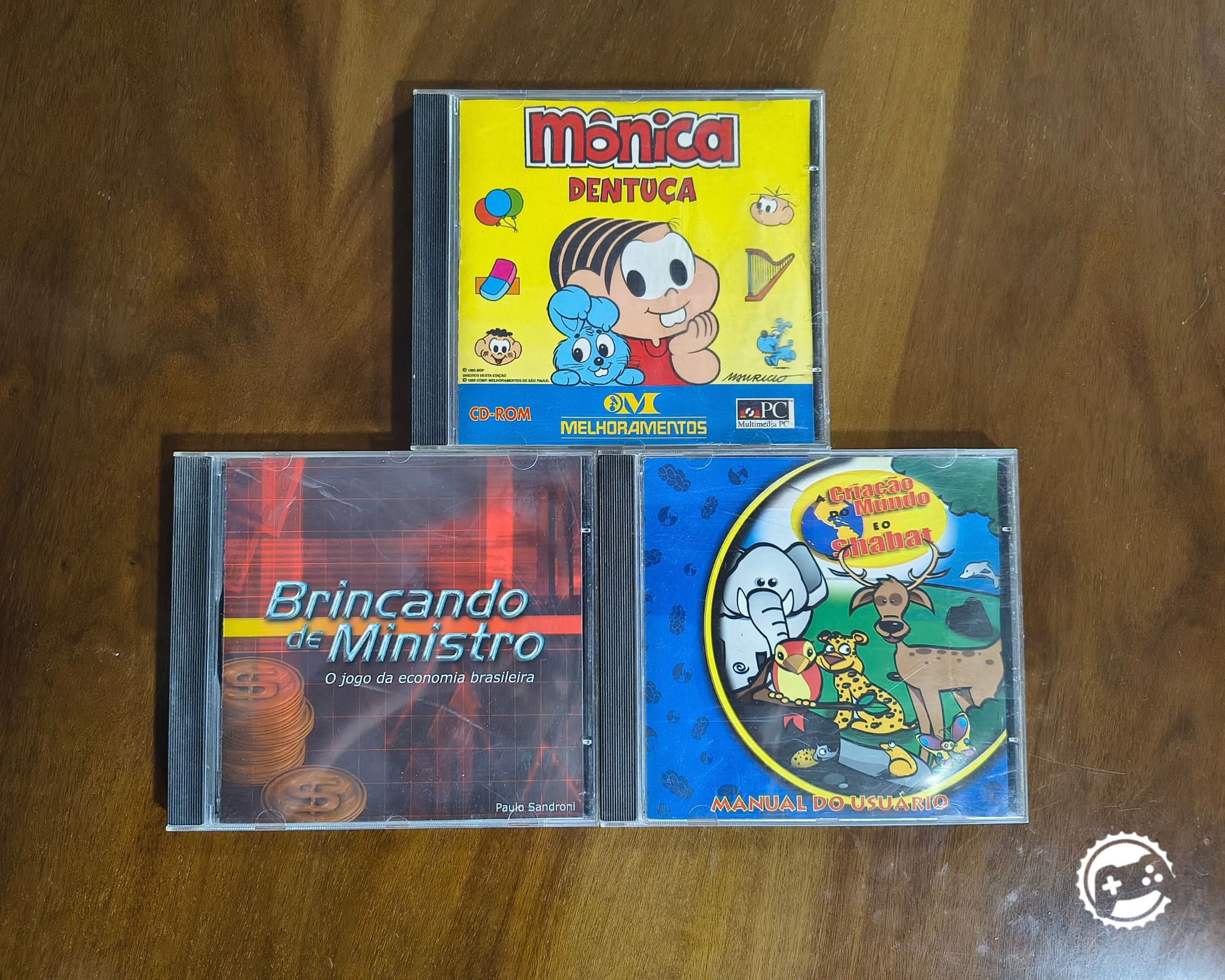 Este é um pequeno lote de jogos brasileiros em CD-ROMs que vão para coleção e provavelmente também para o Internet Archive. São 3 jogos: Mônica Dentuça, Brincando de Ministro e Criação do Mundo e o Shabat.